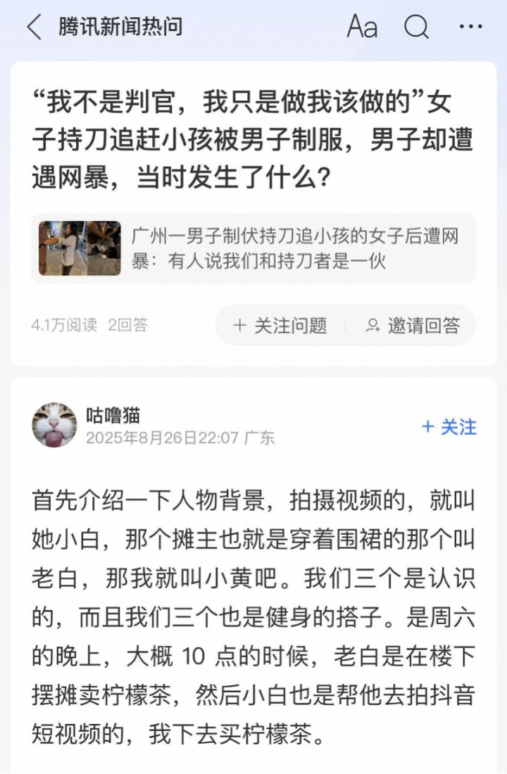近日,制止持刀女子的当事人之一小黄在腾讯新闻“热问”发声。南都记者联系了小黄,听他回顾事件经过。